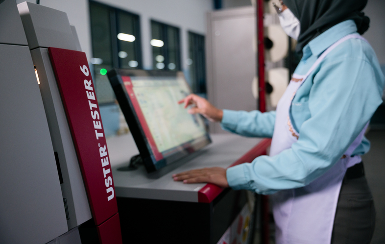 Langkah pertama untuk menjaga mutu adalah pengujian bahan mentah. Mesin lab seperti Uster Tester digunakan untuk mengevaluasi kualitas benang, termasuk kekuatan tarik, kehalusan, dan konsistensi. Dengan alat ini, cacat dapat terdeteksi sejak awal, sehingga proses produksi bisa berjalan lebih efisien.